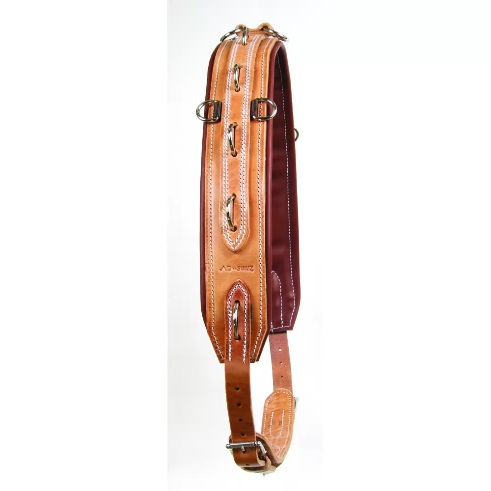 Made from premium Hermann Oak harness leather with a soft lining leather. Multiple dee positions provide an array of possibilities when used in conjunction with driving lines, side reins and many other training aids. One of Al Dunnings favorite training tools and part of our AD signature working tack line. Designed to fit young horses and will adjust 61 to 77 inches.