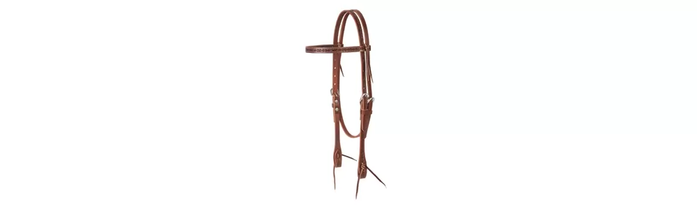 Handcrafted from brown skirting leather, this 5/8″ single-ply headstall features a crisp, deep embossed barbed wire design on the browband, crown and cheeks for a classic look. Whether you’re spending a day on the trail or on the ranch, this headstall offers performance you can count on. Brown alum tanned laces at bit ends. Stainless steel hardware.
