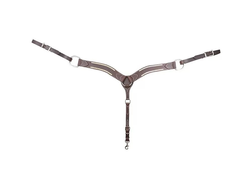 Cashel Rawhide Laced Breast Collar is a chocolate harness leather is laced with rawhide. Breast Collar is 2.