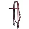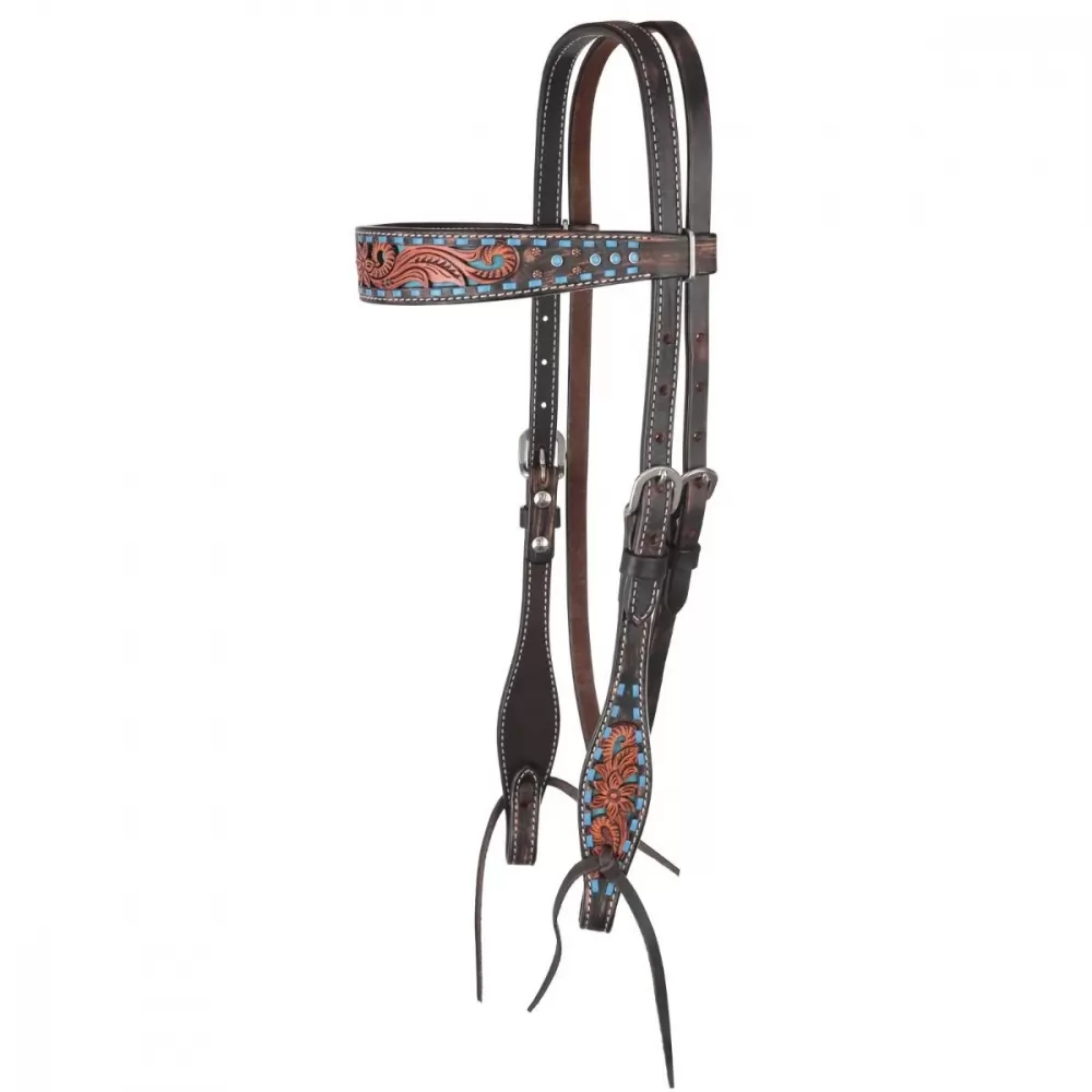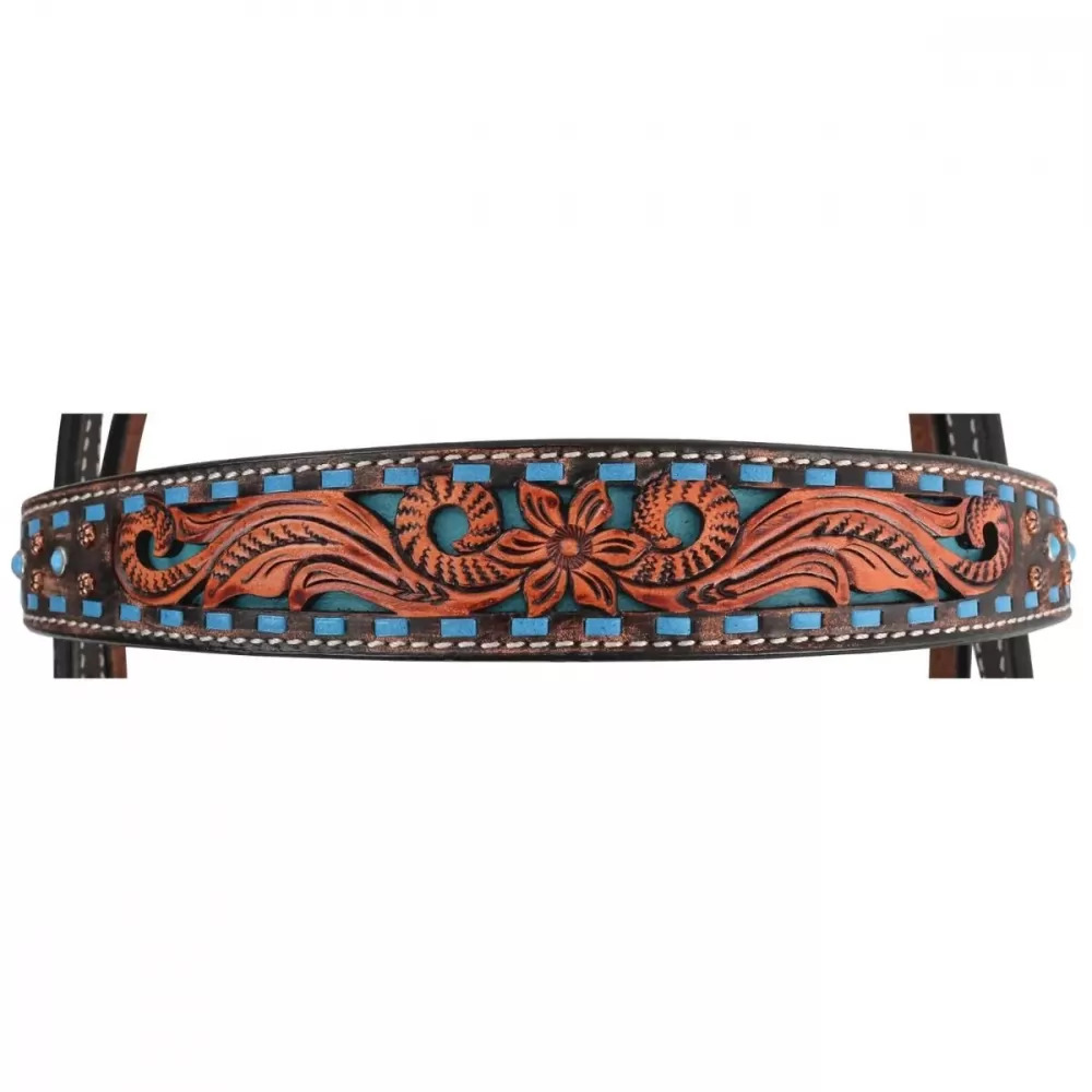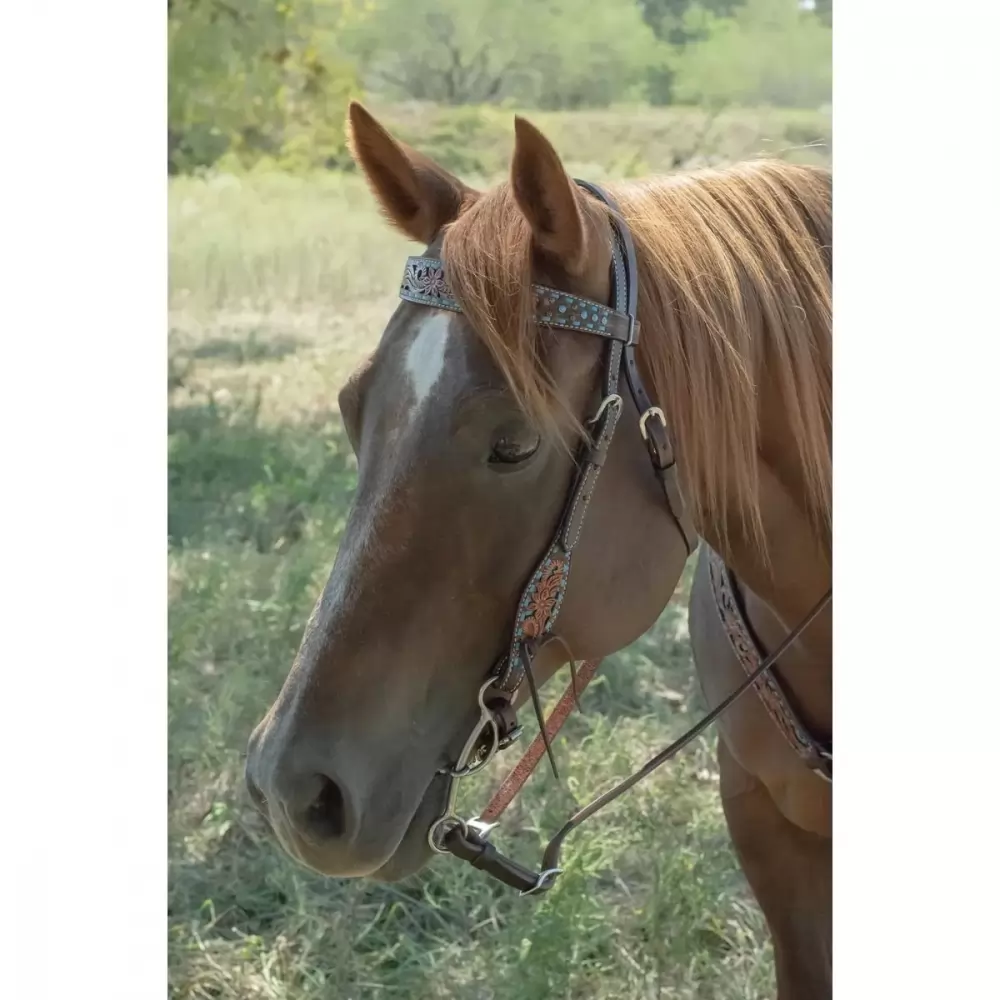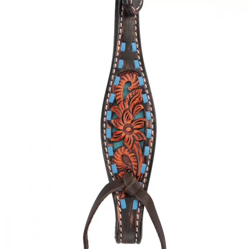 Designed for any coat color, thisBronco Blue Texas Flower tack has hand-tooled Texas floral filigree, carved to reveal a blue underlay that matches the turquoise backstitch border. The headstall has tie ends for ease attaching bit.