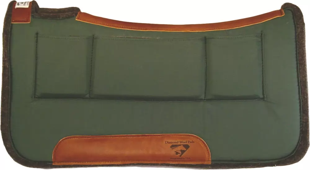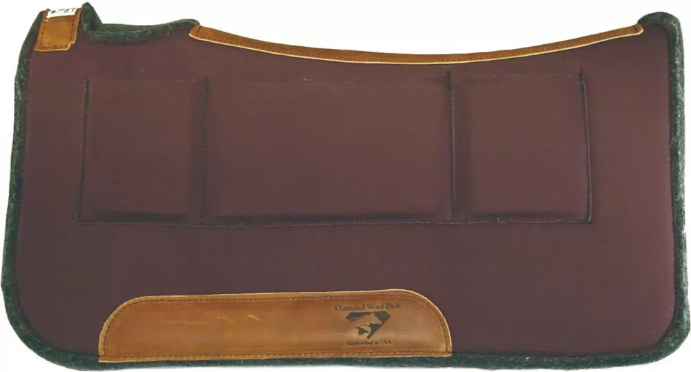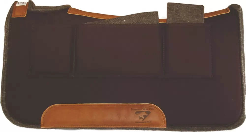 The Contoured Relief saddle pad by Diamond Wool has a durable cotton duck top with a 1″ needle punched Wool felt bottom. Contoured along the spine for an instant fit. The 3 pockets on each side of the saddle pad contain a 1/2″ Wool felt shim which can be removed to better fit a specific saddle to an individual horse.
