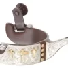 German silver trim, 3/4″ band, 2″ shank, 1-1/2″ 10 point black rowel and engraved buttons.