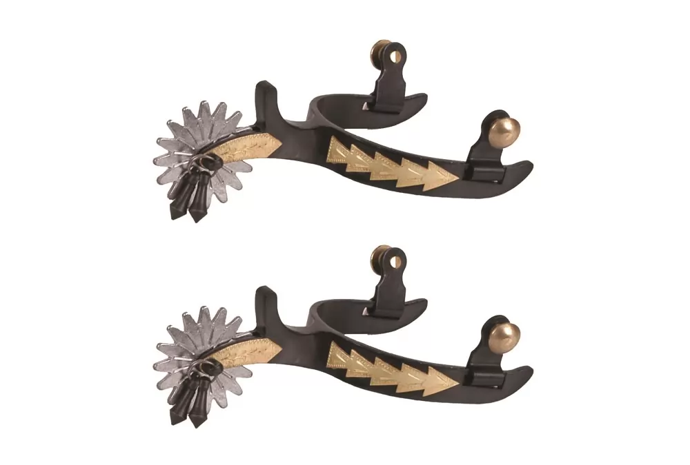 Spurs with engraved brass trim, 3/4″ band, 2″ shank, 2″ 16 point stainless steel rowel with jingle bobs and brass buttons.