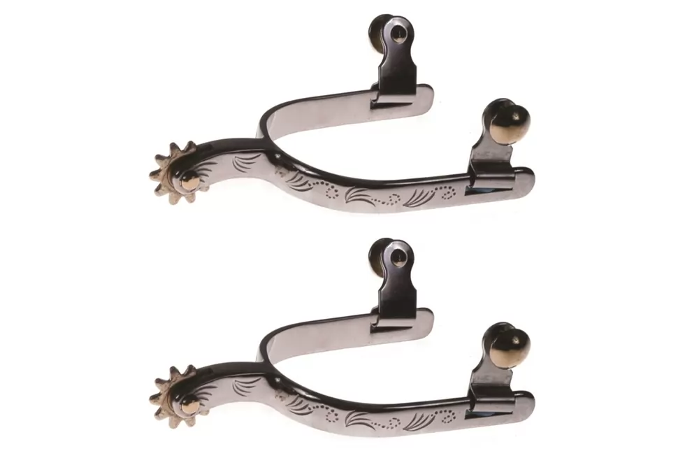 Ladies spurs with 1/2″ engraved band, 1-1/4″ engraved shank and 7/8″ 10 point brass rowel and brass buttons.