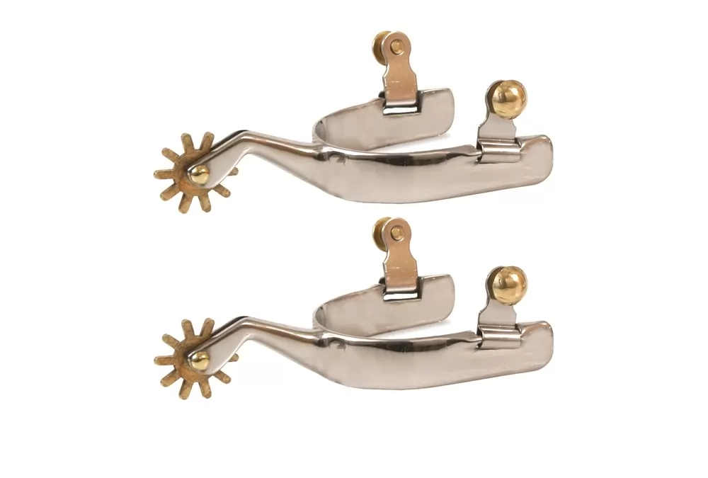 Stainless steel spurs with 3/4″ band, 2″ shank, 1-1/4″ 10 point brass rowel with brass buttons.