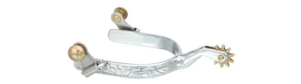 Handsome floral embossed roper spur, 1/2″ chrome finished band and 9 point rowel.