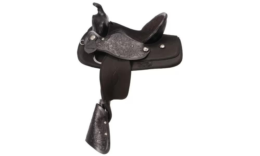 The Blaze Synthetic Pony Package comes with saddle, bridle, girth and saddle blanket. The Saddle has Semi Quarter Horse Bars, a 2″ horn, 10″ swell, 5 1/2″ gullet, and a 4 1/2″ cantle. The skirt measures 21″ x 21″ and it has drop D rigging. The saddle weighs 12 lbs. It has blevins style quick change buckles and neoprene in skirts.