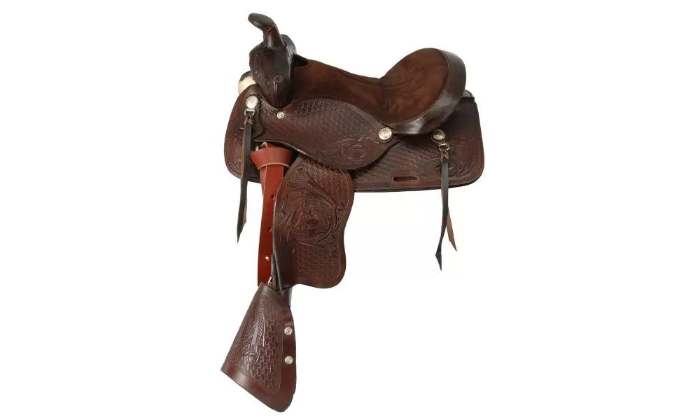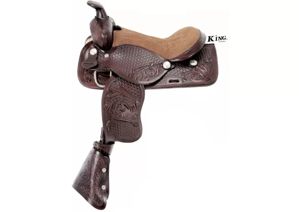 Excellent youth starter saddle built on a 5 year guaranteed rawhide covered tree. Features 12″ stitched suede leather seat, embossed tooling, neoprene in the skirts, Blevins style buckles and embossed hooded stirrups.