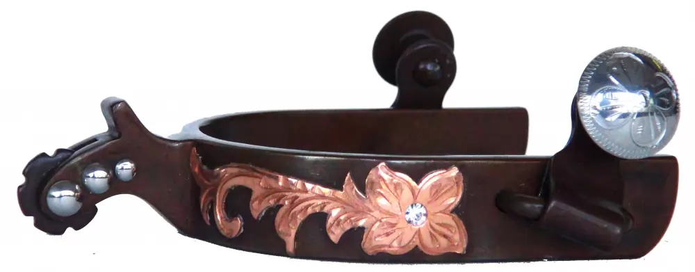 Copper crystal ladies spur by Metalab features copper floral trim with clear rhinestone. Band width 1″; Shank length 3/4″; Rowel 5/8″ rosebud. Antique finish and comes with 4 extra replacement rhinestones. Level one .