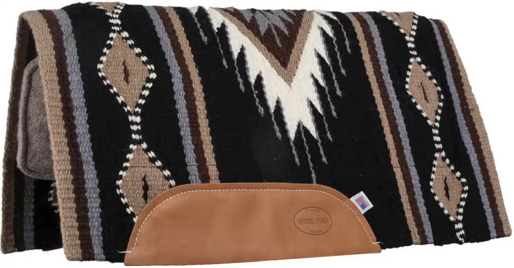 Custom designed 100% New Zealand wool blanket top, one half inch felt center and a half inch tan wool bottom. Pad features top grain wear leathers.