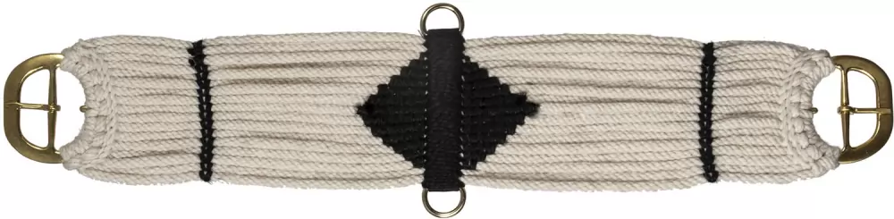 17 strand mohair blend cinch built on solid brass center bar buckles with a black wrapped nylon center and black braided diamond and crossbars.