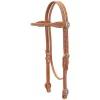 Split-ear headstall with block basket tooling set against a natural backdrop with a deep chocolate border. Stainless steel hardware.