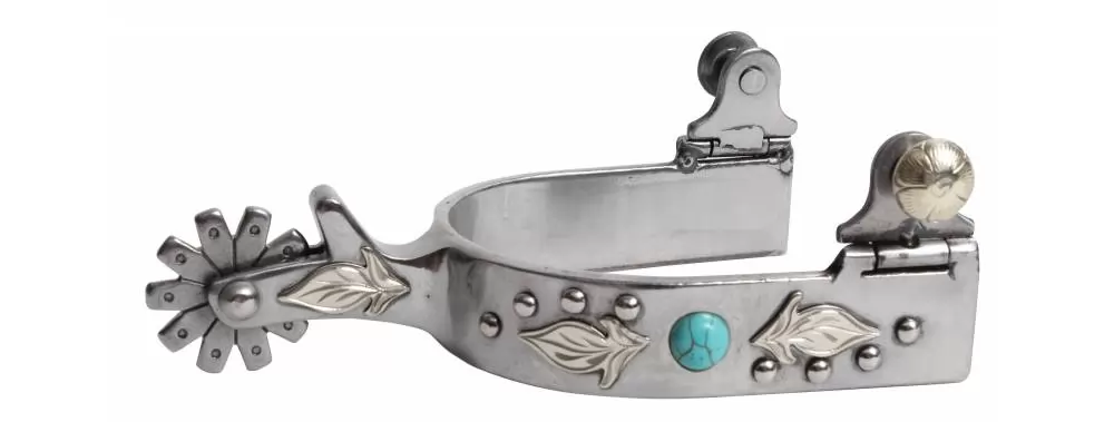 The perfect spur for any western discipline, these feature a decorative silver and colored stone design on the band. Blunted ten point rowel engraved design. Features a chap guard. 1 7/8″ shank. Boot width: 2 7/8″.