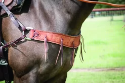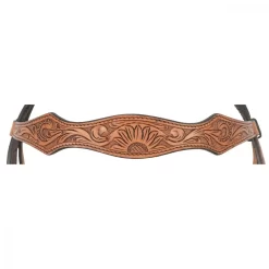 Rolled ear 3/4″ headstall of heavy harness leather that has been hand rubbed, then treated with special heavy oil dressing. Straight cheek, stainless steel buckles.