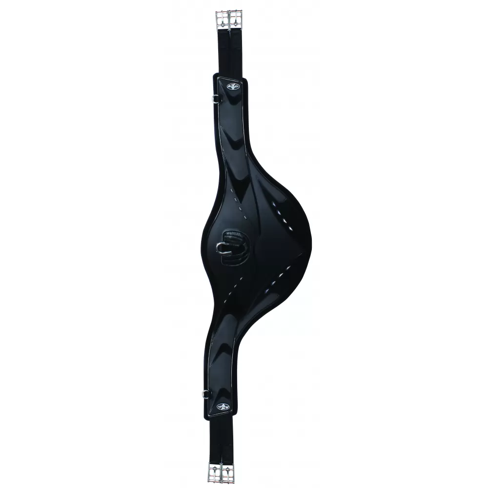 Professionals Choice Contoured Girths are designed with the horse in mind. The contoured design allows your horse freedom of movement in the shoulder and reduces pressure points. A belly guard provides additional protection. The high quality TPU outer shell is durable, easy to clean, and ventilated to keep your horse cool and comfortable. The perforated neoprene liner prevents slipping, allows for airflow, and peels away from the outer shell for an easy clean. D-rings and center carabiner clip are compatible with training aids. Stainless steel hardware is durable and will not rust, and double elastic on each end provides a comfortable fit. Available in long or monoflap styles.
