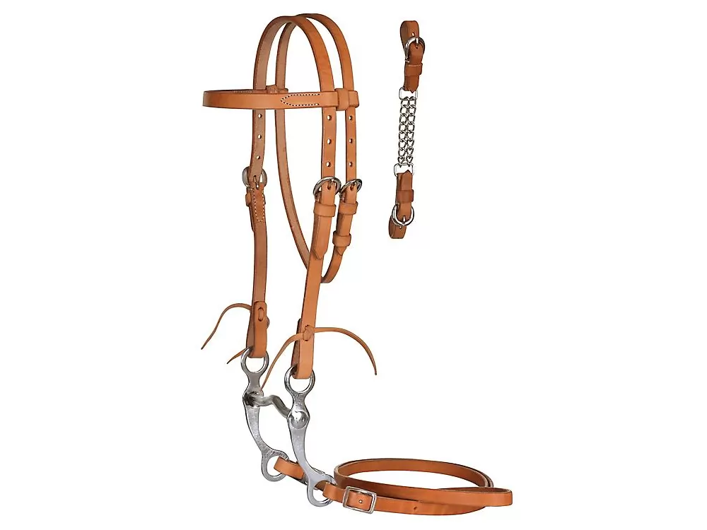 Pony sized set includes headstall, solid low pony sized port bit, 6′ roping rein, and curb chain.