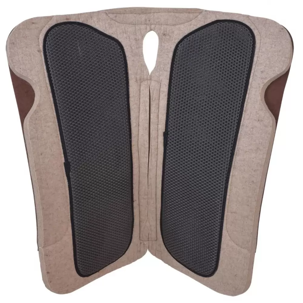 Made of thick, 100% wool, which provides excellent shock absorption, releases heat build-up, and holds up well to abuse. The contoured design molds to the horse’s back to better fit the shape of the horse and helps to keep the pad in place. The pad bottom is Tacky Too material, which is non-slip, pressure distributing, durable, and won’t pull hairs. Heavy oil tanned wear leathers for durability.