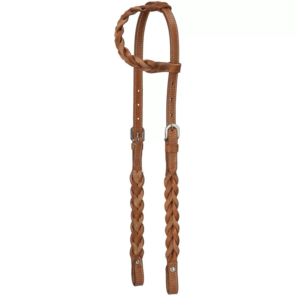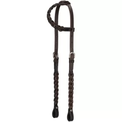 A twist on the old classic one ear headstall. Braided leather cheeks and ear, adjustable on both cheeks for a custom fit. Chicago screw bit ends.