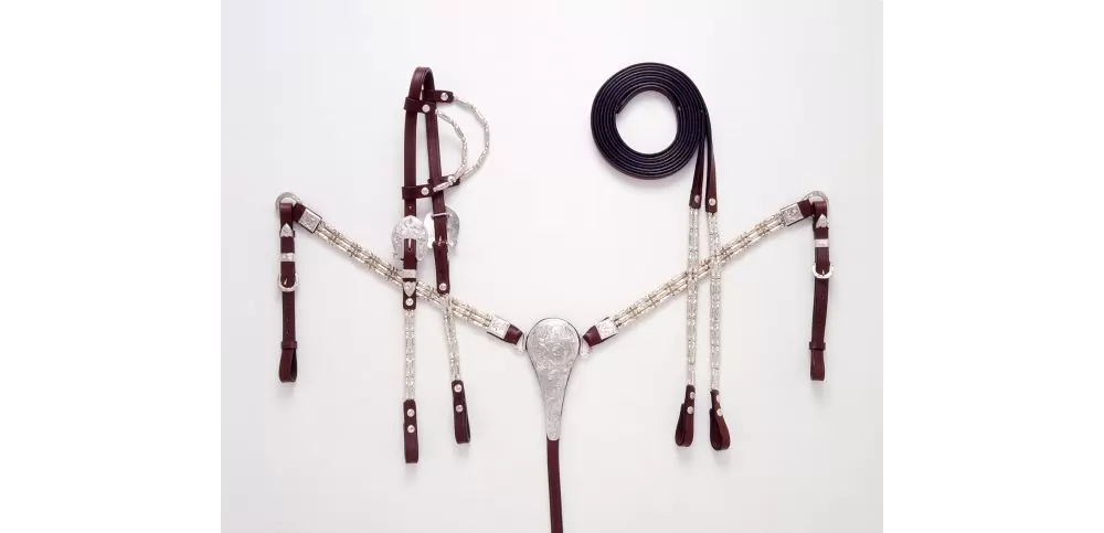 Crafted of fine bridle leather highlighted with engraved silver ferrules. A very classy double ear show headstall!