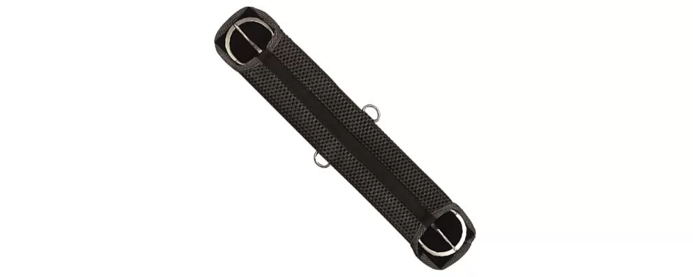 Very soft no slip material makes up the body of the girth. The open weave of the PVC helps the girth area stay cool. Will not absorb sweat. High quality binding. Stainless steel hardware throughout. Two Ds are place in center on each side for attaching training aids, breast collars etc.. Will not hold bacteria, is easy to clean.