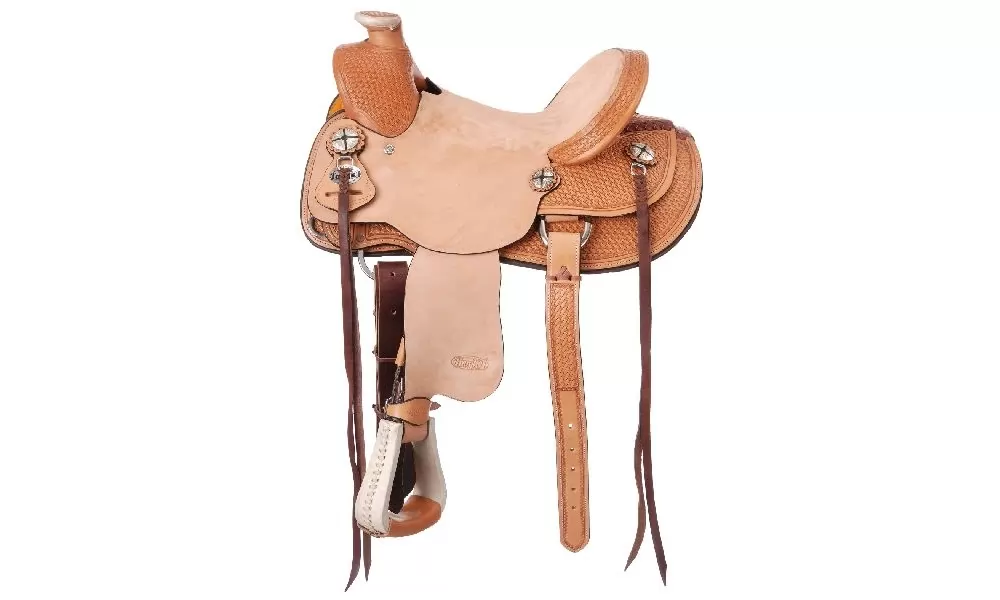 Complete with: saddle, headstall, reins, girth, and saddle blanket.