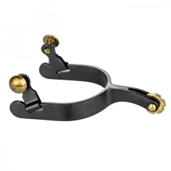 Blued Steel Roping Spurs with 5/8″ band, solid brass buttons and 5/8″ solid brass rowel on a drop shank.