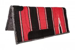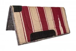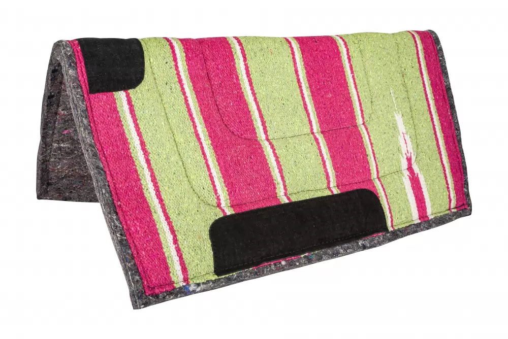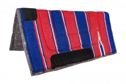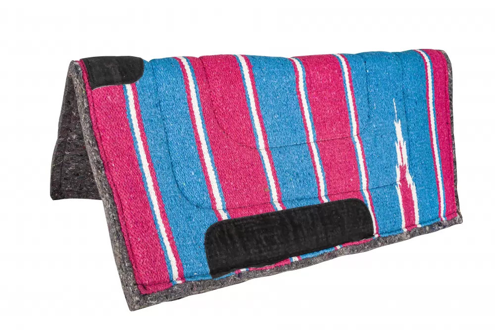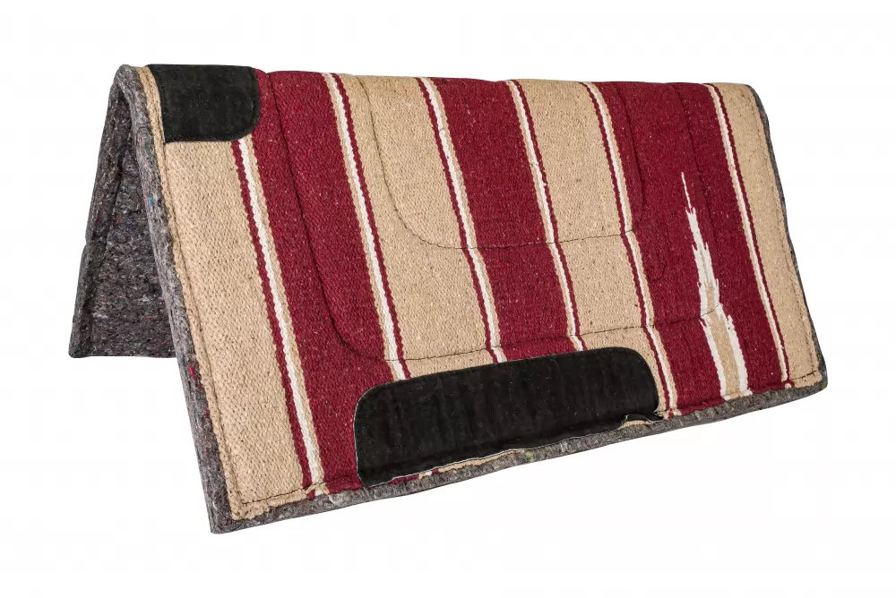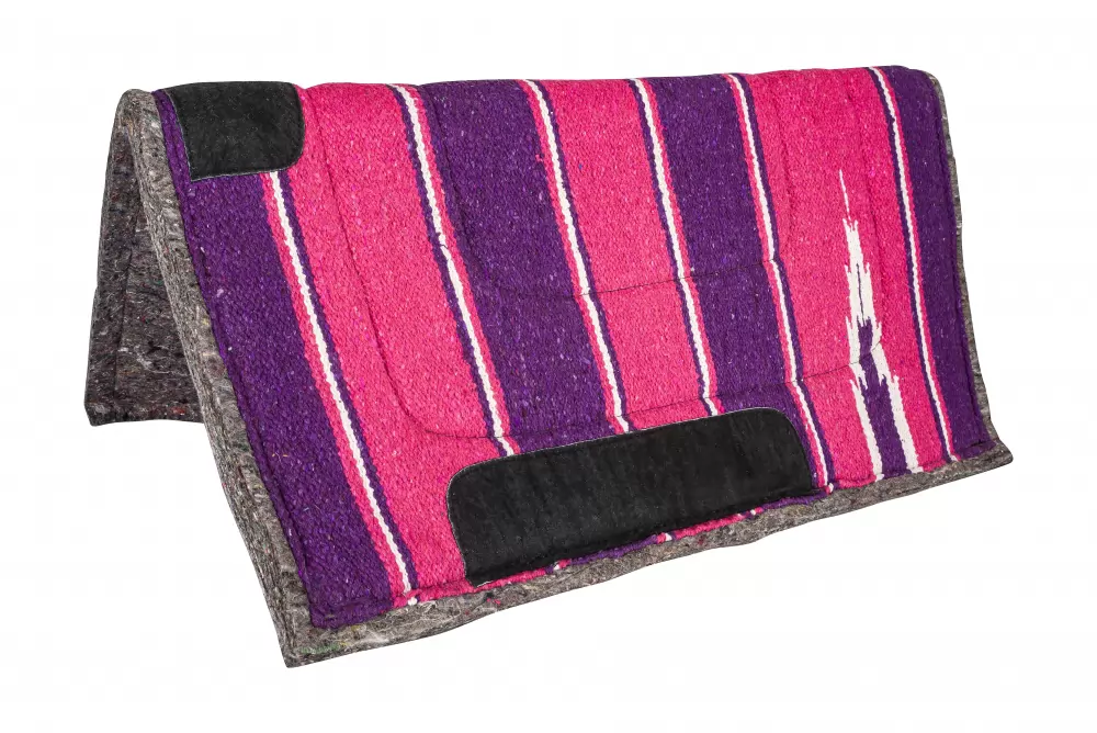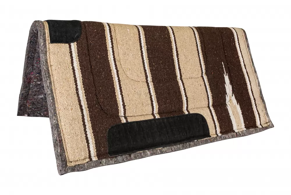 Pad features a hand woven cotton/acrylic Navajo blanket top and a full high grade felt bottom that resist compression and wicks away moisture to facilitate natural cooling.