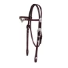 Leather browband headstall with basket tooling, sun spot studs, rawhide buttons, and gooseberry conchos, plus split reins.