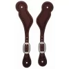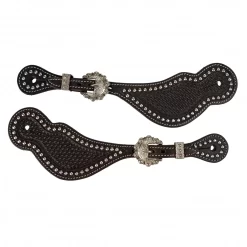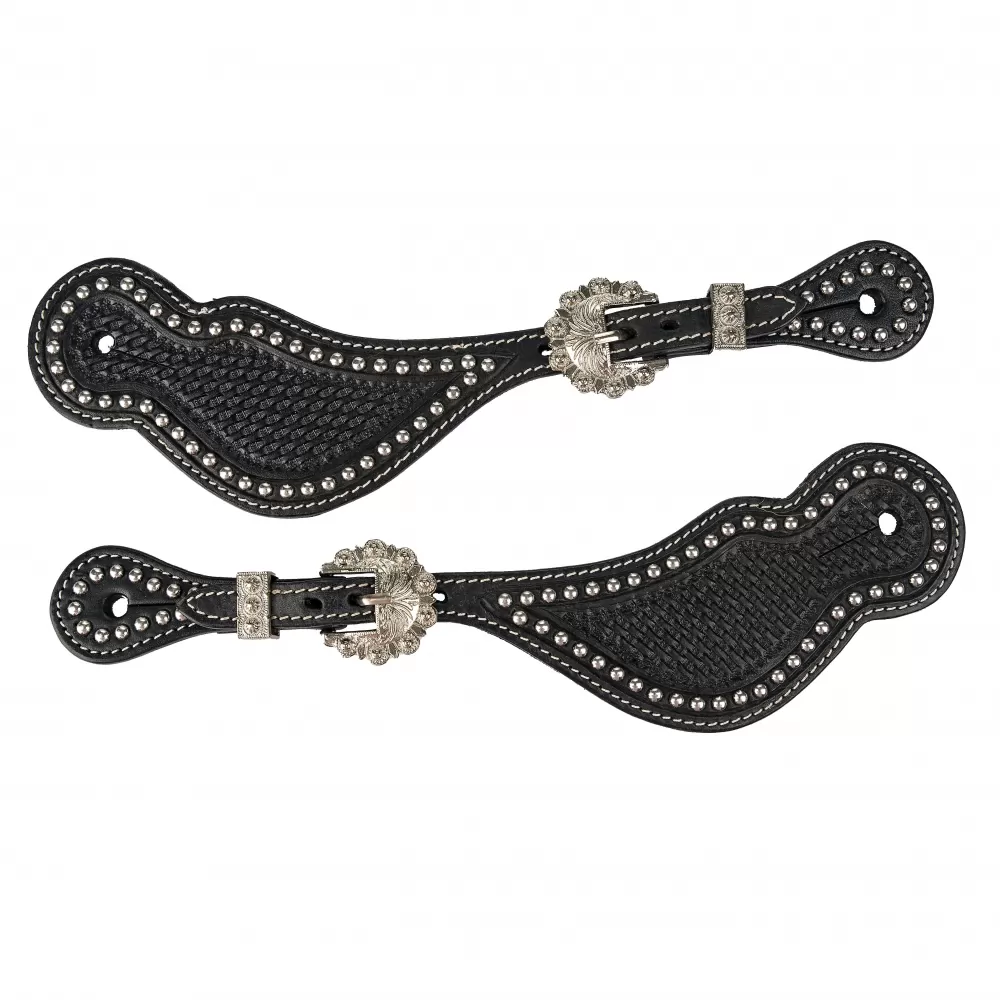 Tabelo Shaped Spur Straps with Studded Trim. Basket tooled Argentina skirting leather. Nickle plated hardware. Size: 26cm hole to hole.
