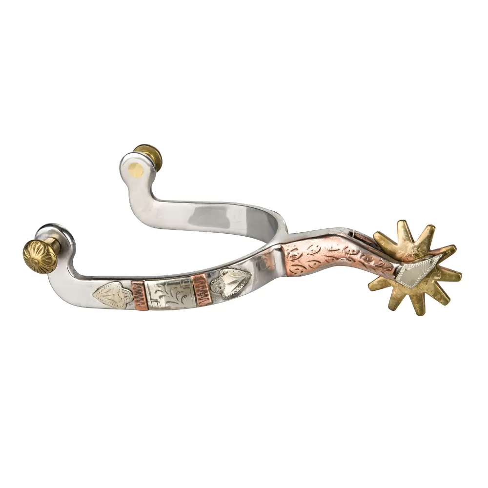 Stainless steel Gal Leg Spurs with 1/2″ band engraved copper & silver trim, Gal Leg shank and solid brass 10pt rowel.