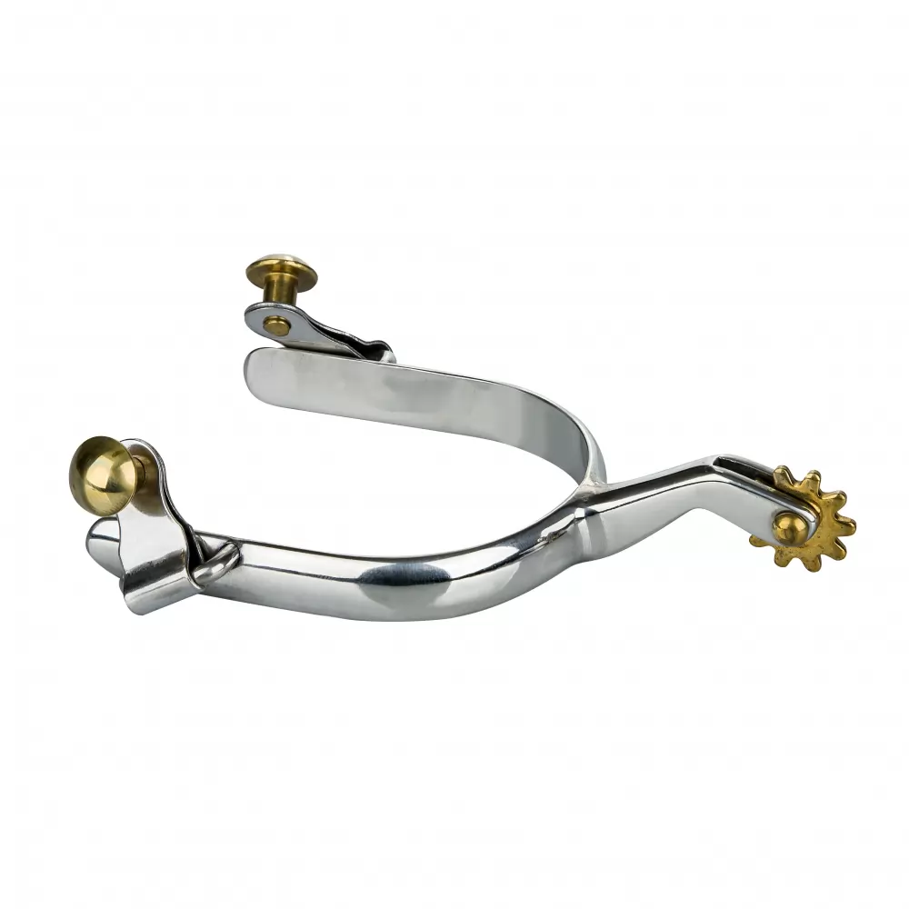 Stainless Steel Gooseneck Spurs with 9/16″ wide band, 5/8″ solid brass 10 pt rowel and brass buttons.