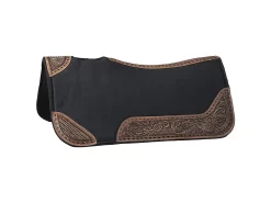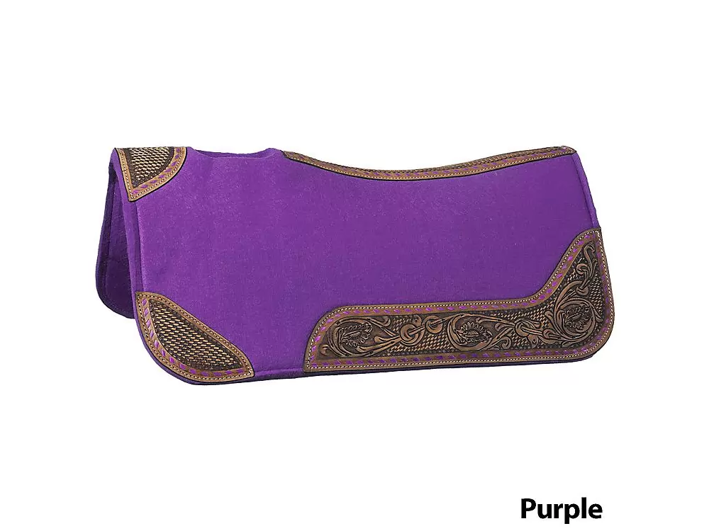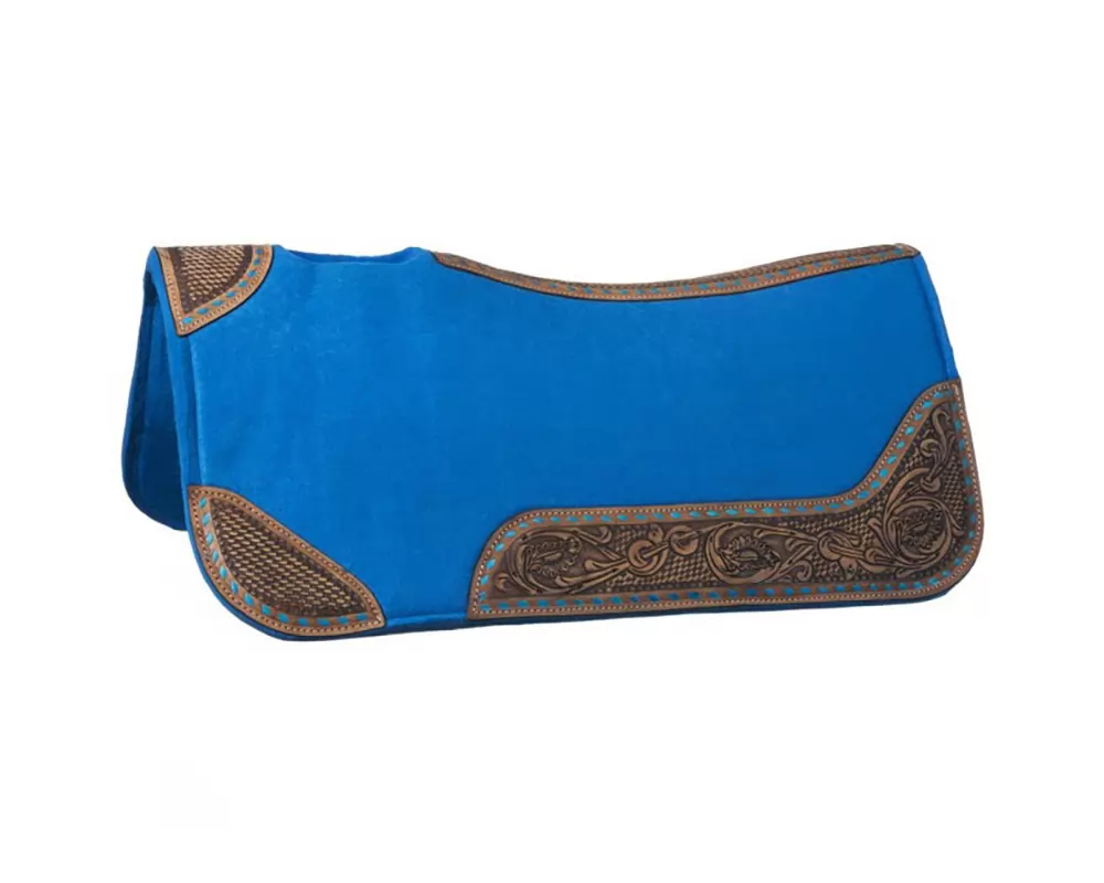 30 x 30 contoured felt saddle pad. Features hand tooled floral and basketweave leather accents with buckstitching details.