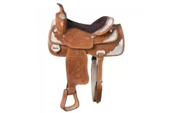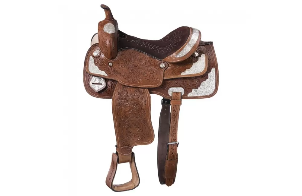 The Tough-1 McCoy Trail Silver Saddle Package features floral tooling with silver overlay accents, suede seats and silver conchos. Silver buckle tip keepers and roughout fenders complete the look. Package includes McCoy Trail Saddle, matching browband headstall with split reins.