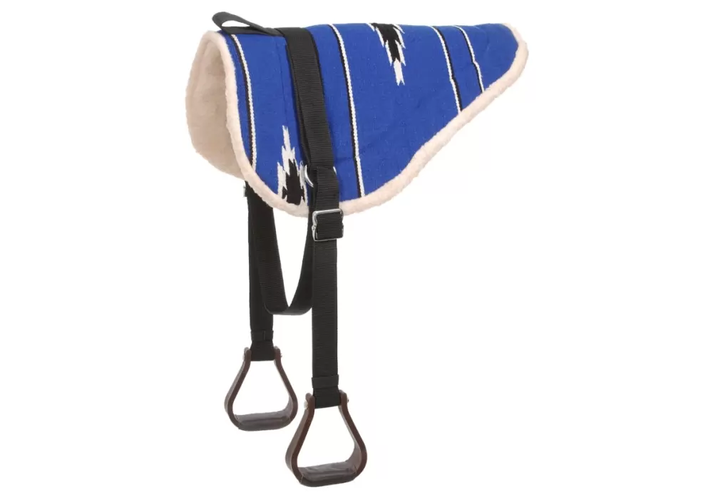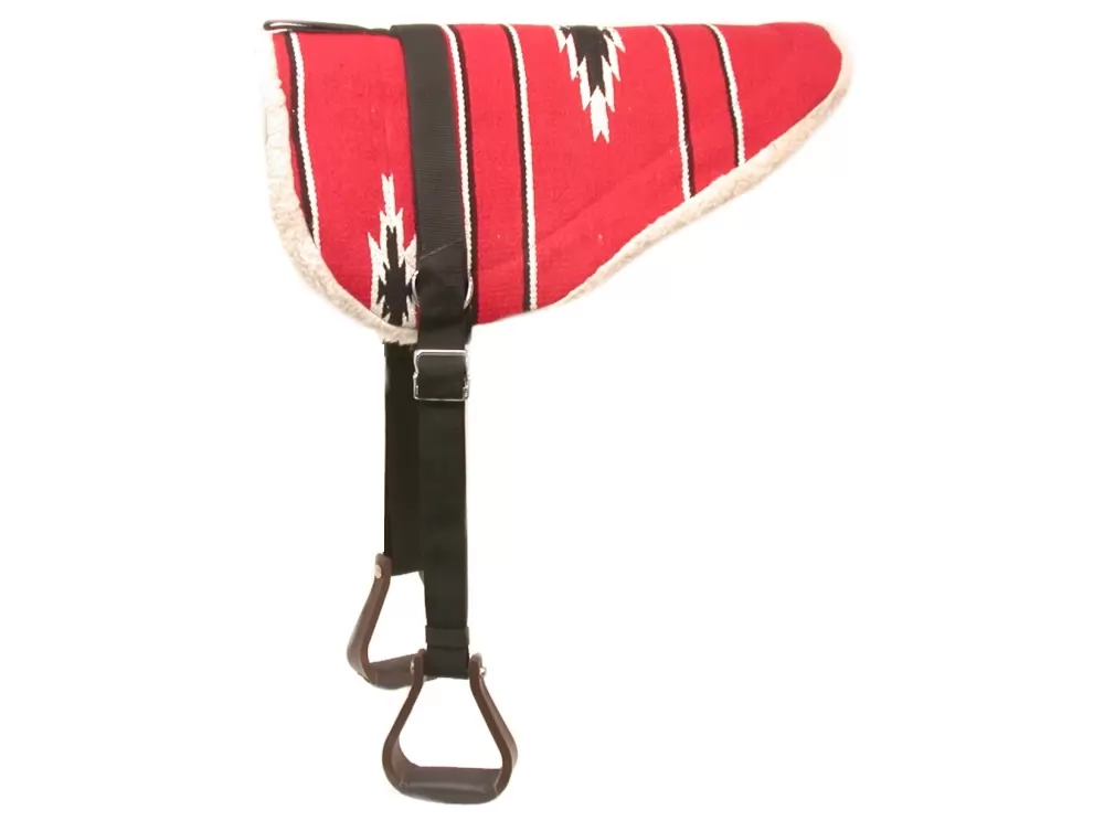 Made with a navajo style top for comfort and good looks. Strong web hand hold, girth and stirrup straps. High impact polymar stirrups. Heavy felt center and fleece bottom.