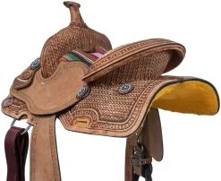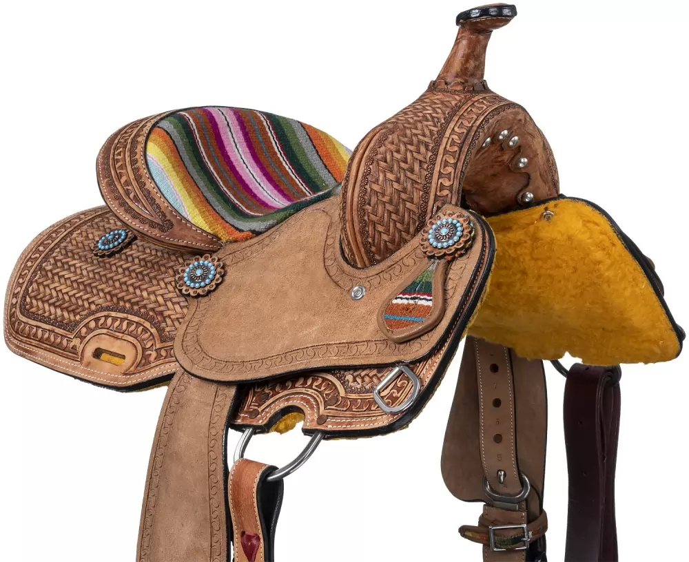 A winning barrel saddle with fun southwestern inspired details from horn to stirrup. This saddle is built on a rawhide wrapped fiberglass tree with quarter horse bars to fit most average horses. It features a deep barrel seat with colorful wool serape design and roughout jockeys and fenders for ultimate grip. Hand tooled woven and serpentine designs cover nearly every inch of this saddle making it a show stopper from the arena to the trail. The in-skirt rigging design eliminates bulk under the leg for a closer contact feel. Complete with Tough1 quick change stirrup buckles, and aluminum barrel stirrups with non-slip tread.