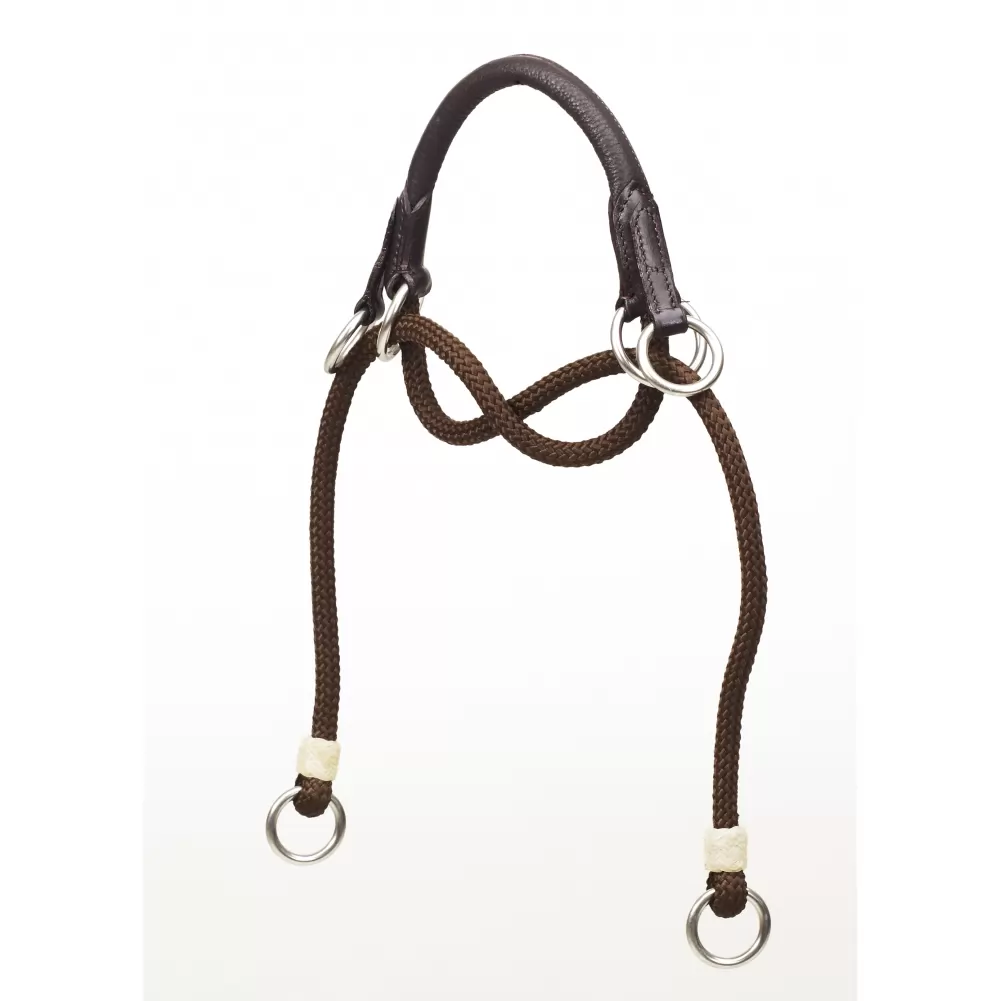 This Bitless Noseband is made with a combination of quality genuine full grain leather, strong braided polypropylene and authentic rawhide accents. The rolled leather section for the nose with rings can attach to any bridle or headstall with the durable braided polypropylene rope straps with rings that your reins attach to. By pulling back on your reins the pressure will increase in the chin and nose provide contact with your horse.