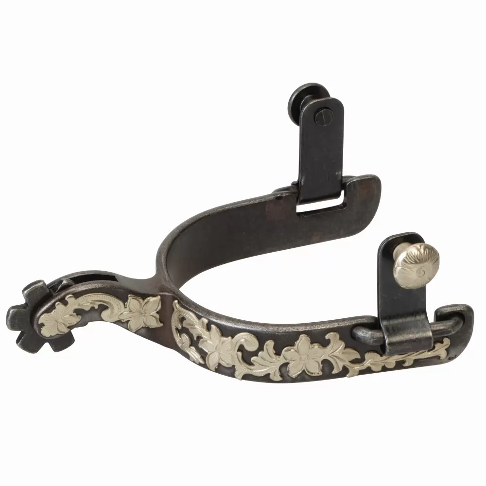 These show spurs feature a 1-1/2″ shank, 3/4″ band and 6 point rowel. German silver floral trim offers an added touch of style. Brushed stainless steel or buffed black option. Ladies’ size.