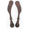 These barrel spurs feature a 3/4″ band and are accented with a chevron and floral design with German silver and copper accents. Available in brushed stainless steel or buffed black. Ladies’ size.