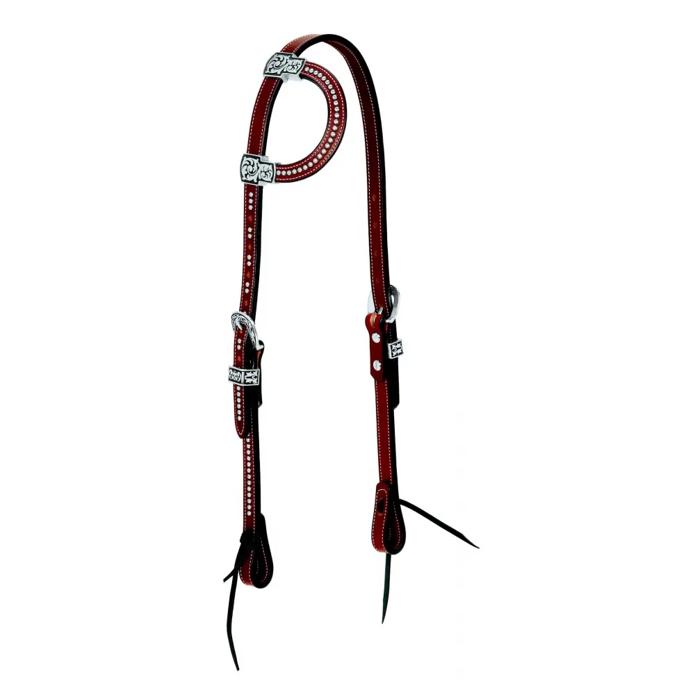 Handcrafted from rich brown premium English bridle leather, this 3/4″ headstall with 5/8″ flat sliding ear coordinates with medium oiled saddles for a great put-together look. Horse Shoe Brand floral stainless steel hardware with black accents designed by custom saddlemaker Jeremiah Watt and etched nickel brass spots offer a high end look that’s perfect for the show ring. Black chrome tanned laces at bit ends.