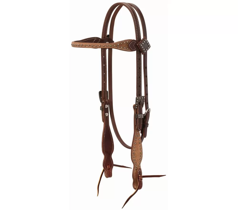 Rough out oiled canyon rose harness leather gives this headstall adorned with matte pewter spots the perfect touch of western style. Weaver Leather exclusive buffed brown hardware with squared design has an aged patina for an antiqued look. Details like a scalloped cheek design add extra on-trend style that will look great on your horse. Leather ties at bit ends for easy bit changes. Horse size.